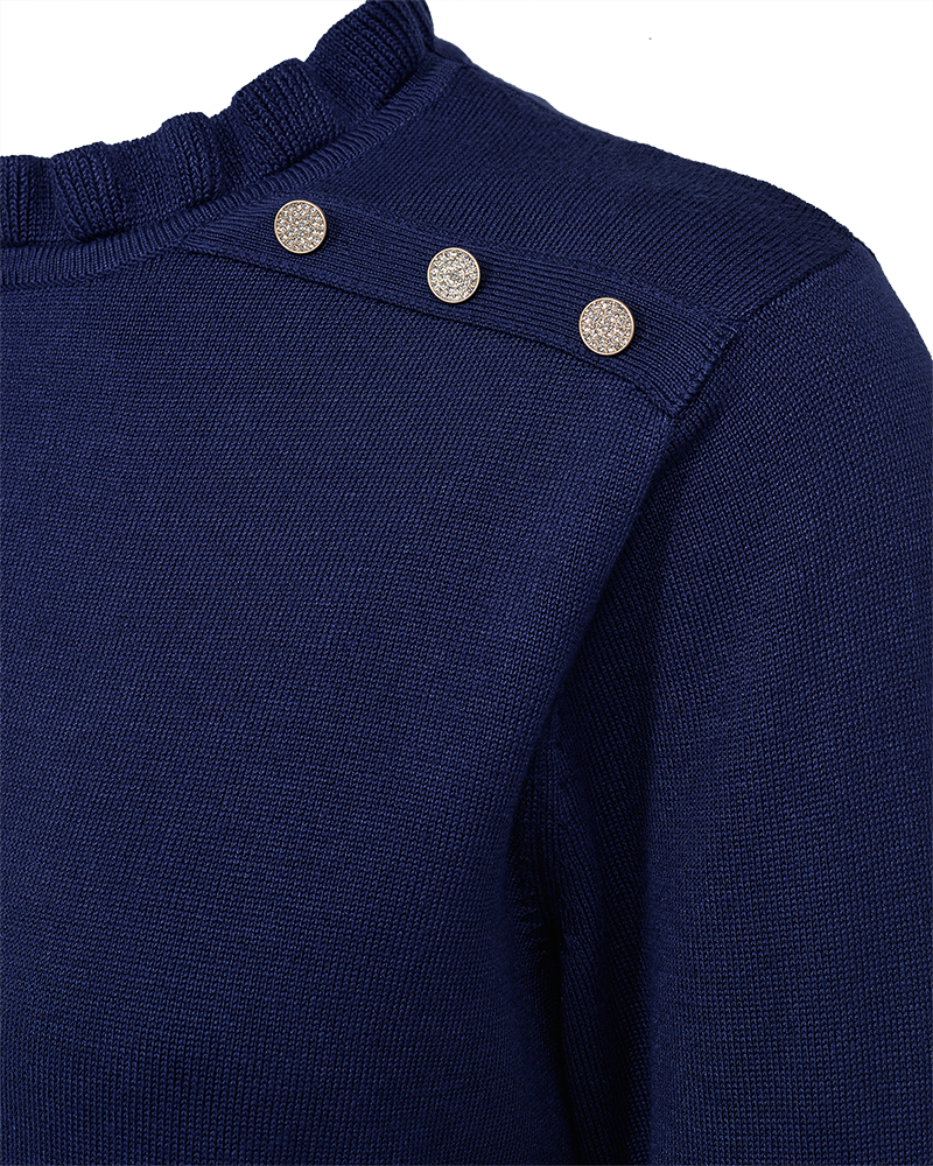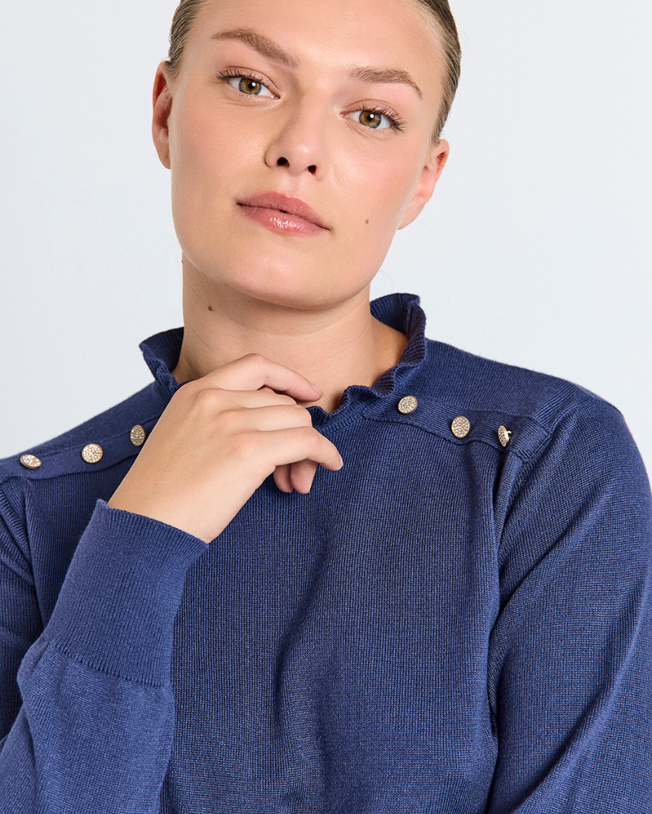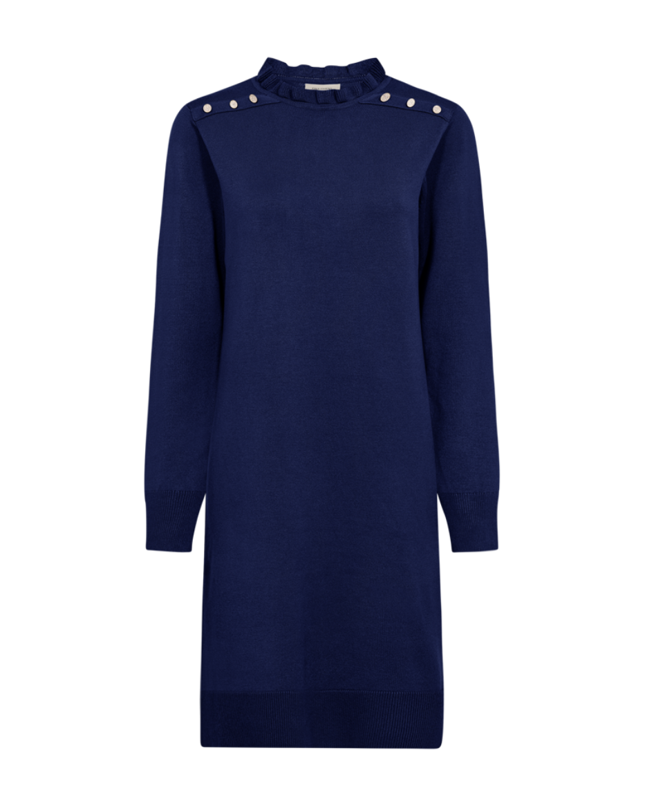 Katie er strikkekjolen du bare må ha! Kort og rett i modellen, med lekre detaljer som løfter hele looken. Gullknapper på skuldre og nederst på ermene gir et eksklusivt preg, mens den lille rysjekanten i halsen tilfører en feminin touch.