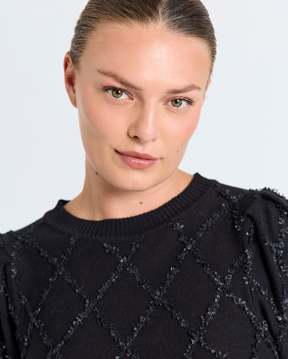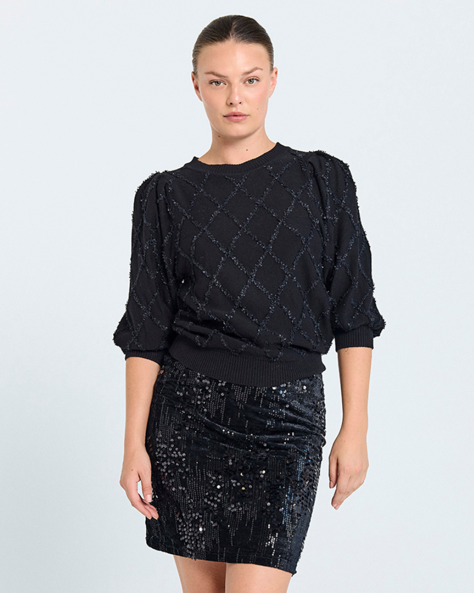 Safri er den perfekte genseren når du vil være både søt og stylish! Kort erme med liten puff gir et trendy uttrykk, og den innstrikkede blondedetaljen løfter hele looken. Rund hals og feminin passform gjør den superfin både til bukse og skjørt.