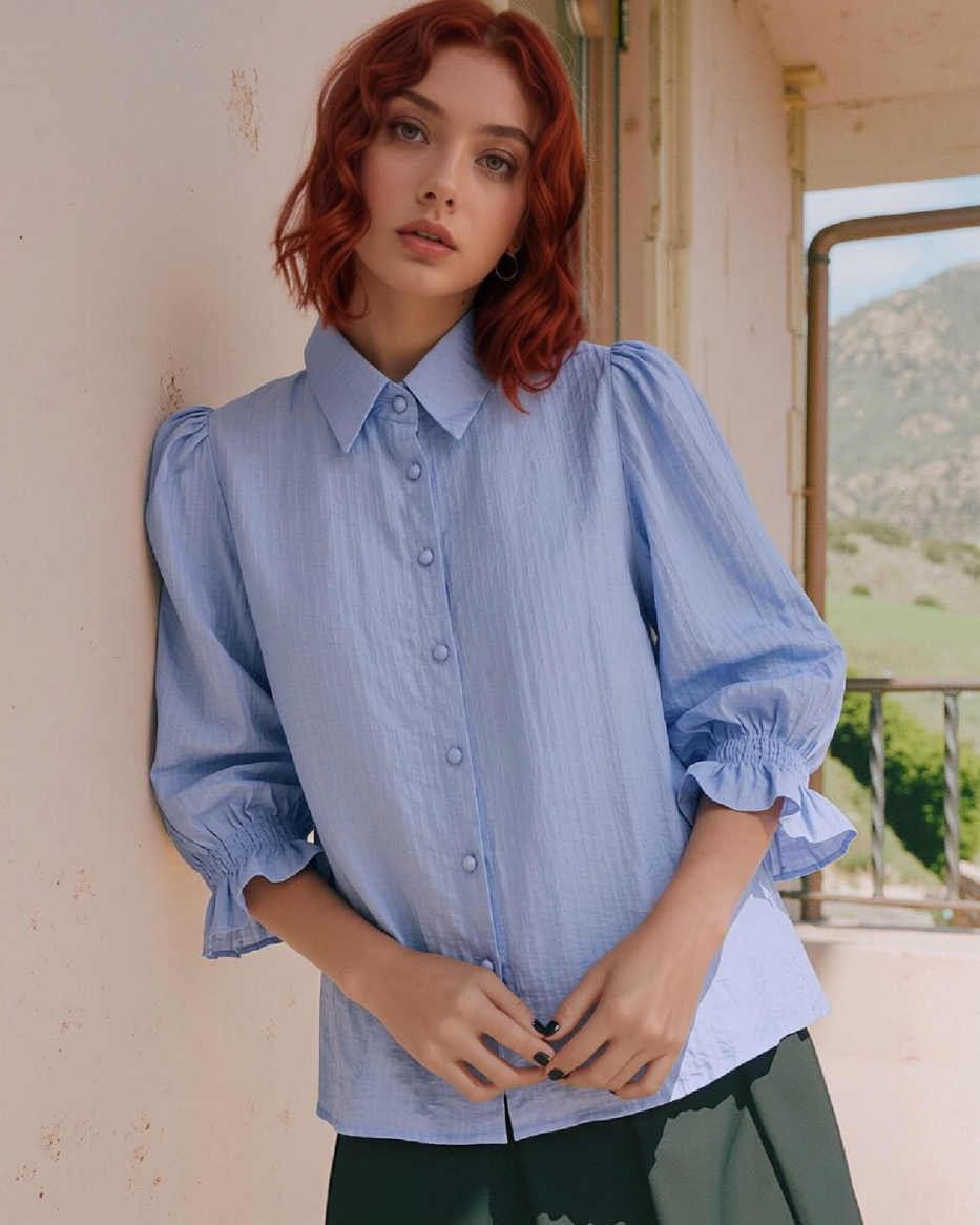 Skuldrene har lett puff og fine legg som gir en feminin form, mens de halvlange ermene avsluttes med behagelig strikk. Tekstiltrukne knapper i front sørger for en gjennomført og elegant finish.