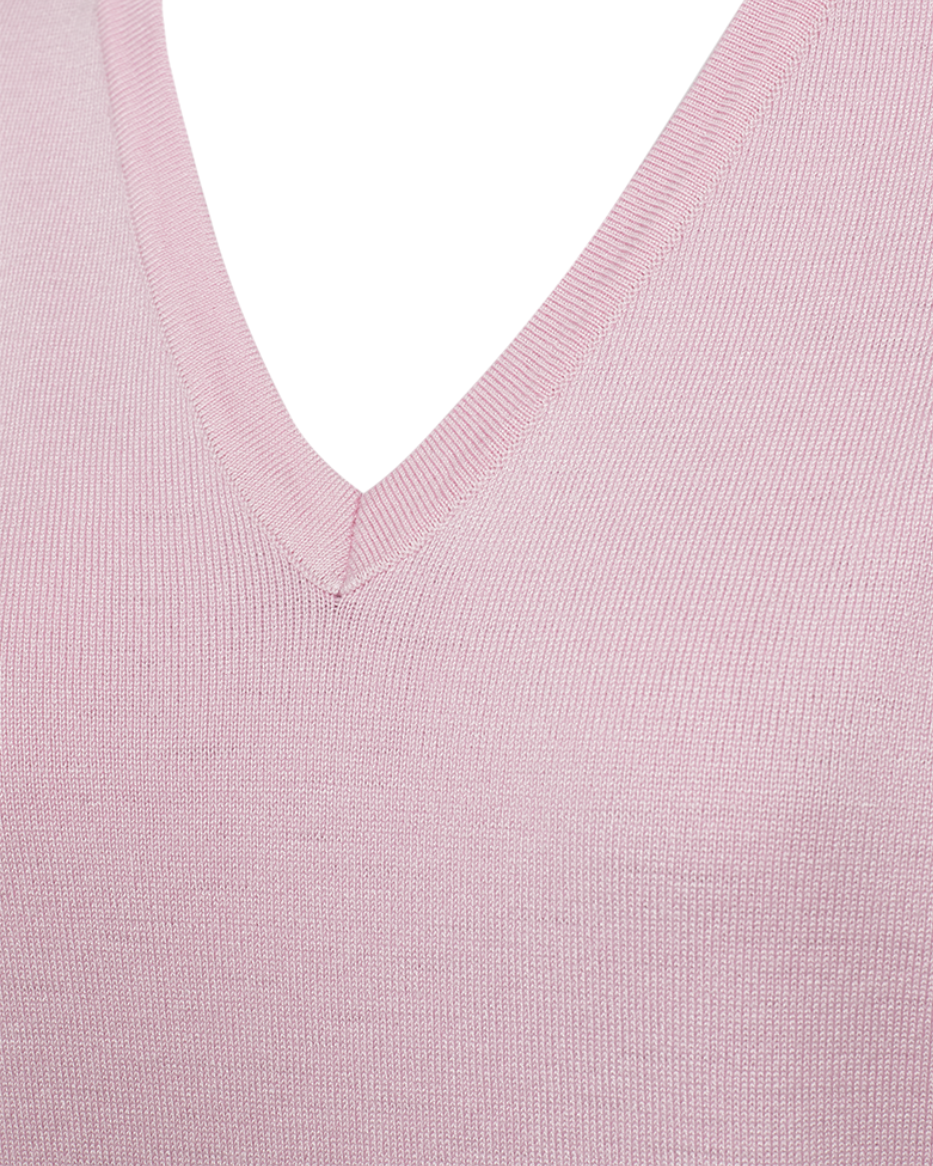 Katie er en tidløs og feminin strikkegenser i en helt glattstrikket modell som gir et rent og sofistikert uttrykk. Den har V-hals som åpner fint opp og korte ermer som gjør den perfekt til både overgangssesong og lag-på-lag styling.