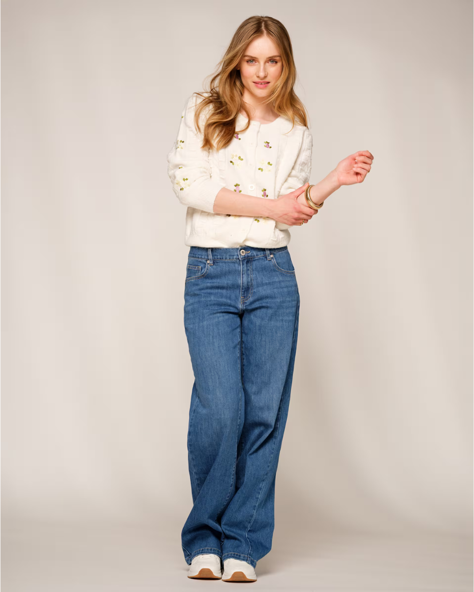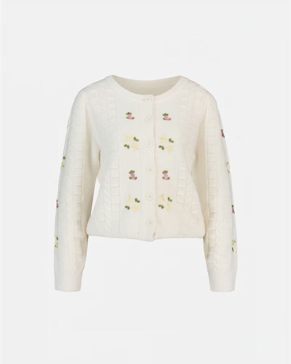 Den har hvite knapper med lekkert design og vakker flettestrikk dekorert med små broderte blomster som gir plagget et søtt og gjennomført preg. De myke maskene gjør cardiganen behagelig å bruke hele dagen – like fin til hverdags som til litt pyntede antrekk.
