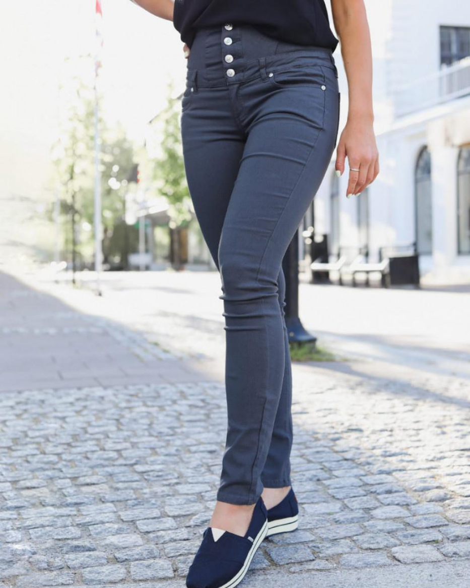 Bukse med ekstra høyt liv, fire knapper og smal passform. Baklommene er plassert midt på rumpa.