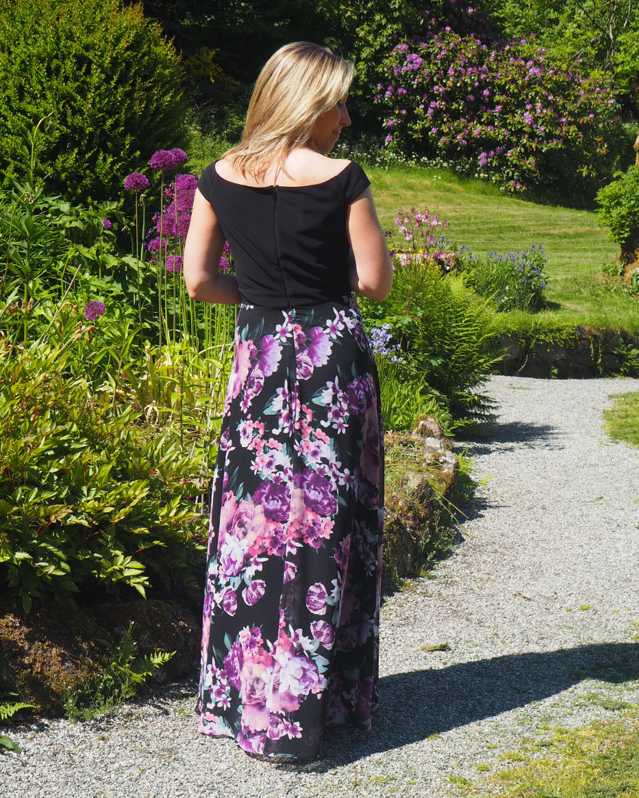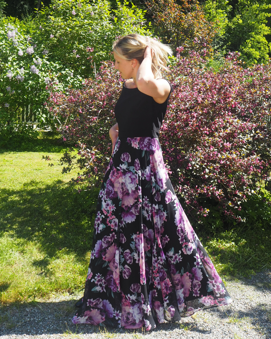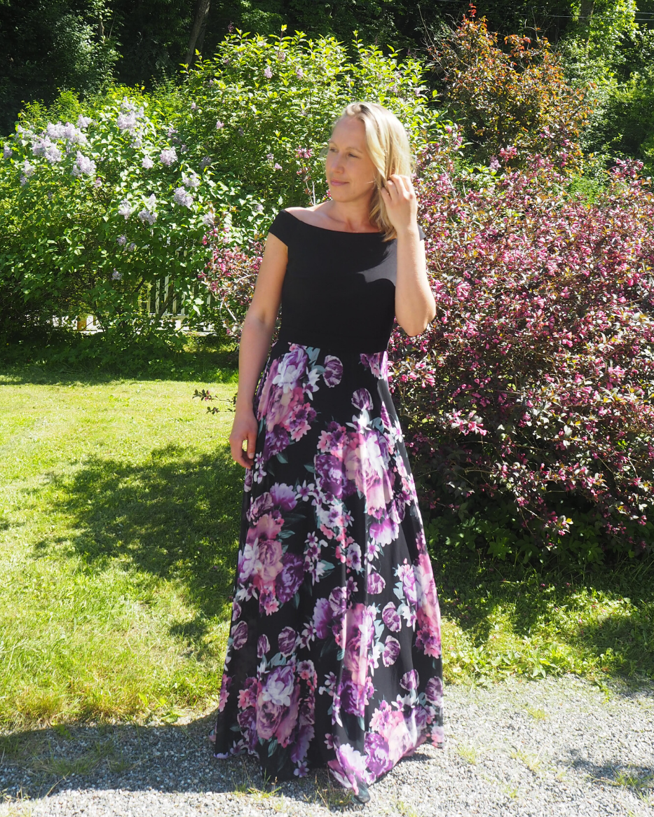 Selskapskjole i lett kvalitet. Kjolen har søm i livet med påsydd kant i samme materiale. Skjørtet har stor elegant vidde som gir flott effekt. Overdelen er i elastisk materiale og gjør passformen veldig fin.