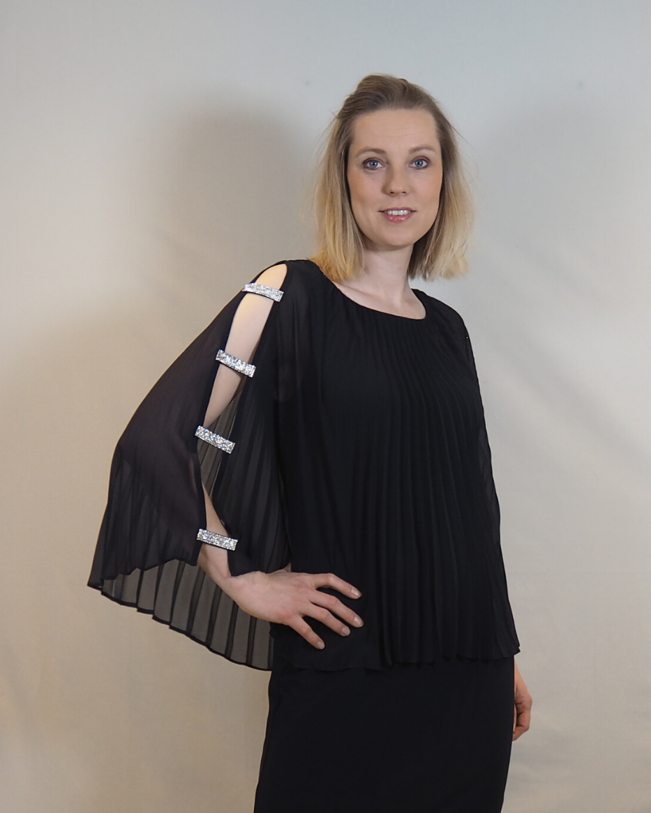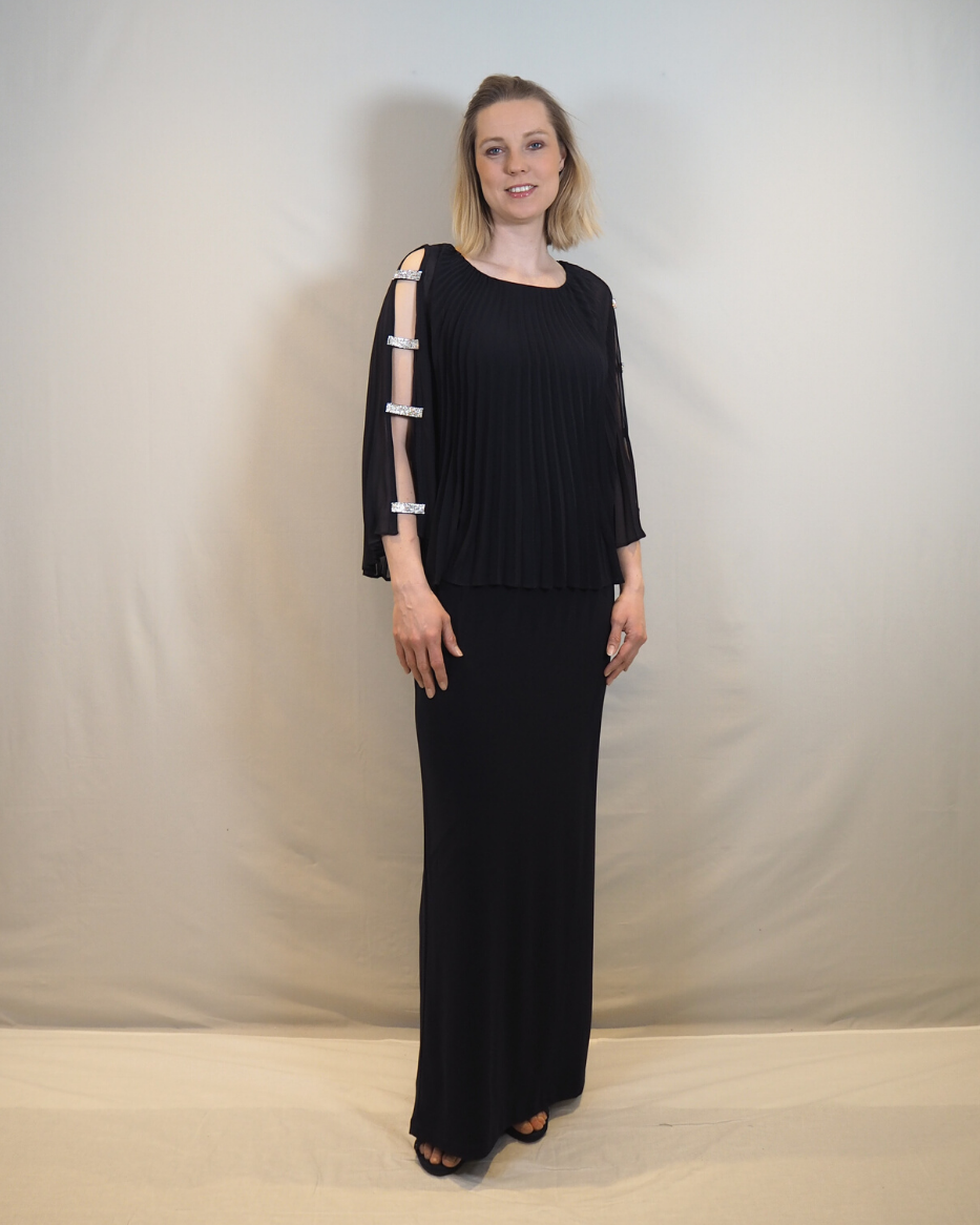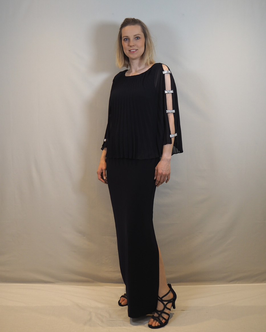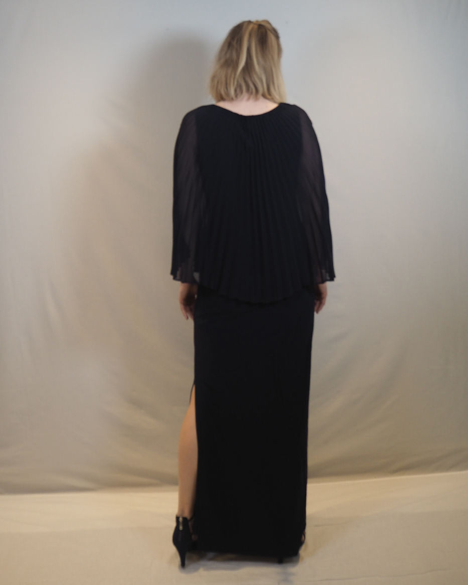 Nydelig selskapskjole i myk elastisk kvalitet. Kjolen har en smal/rett modell under det lekre sjalet. Det er plissert og har strass sydd inn som pynt. Fin passform til de fleste. Kjolen har glidelås til lukning i siden og fôr.