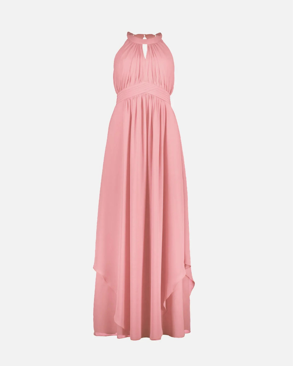 Ankelsid selskapskjole i delikat chiffon. Den har halterneck med liten åpning foran i halsen, 2 knapper i nakken og bred vaffelstrikk i ryggen. Draperte detaljer i midjen. Legg øverst i skjørtet skaper en flatterende silhuett. Skråskjærte detaljer i skjørtet. Tynt fòr. Matchende sjal i chiffon følger med.