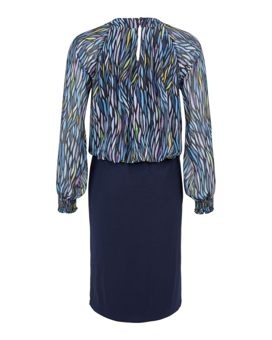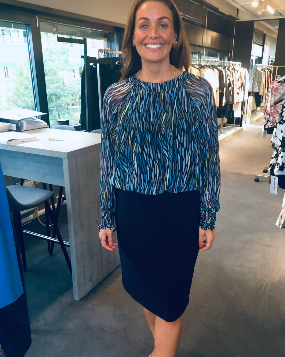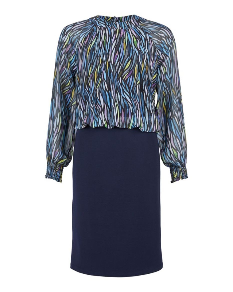Kjole med løs topp og smalt skjørt for en fin passform. Kjolen har fine voluminøse ermer med en smock.