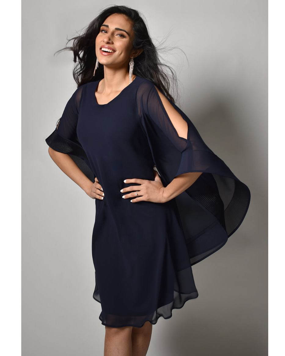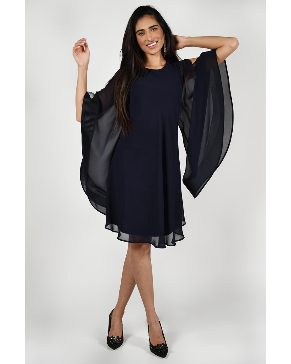Vår korte kjole i chiffong med vide, elegante ermer og A-form skaper en tidløs og sofistikert look som vil ta pusten fra deg. Denne A-shape kjolen er designet for å fremheve din feminine silhuett med sitt elegante snitt og luftige chiffongstoff. De vide ermene legger til en ekstra touch av glamour og bevegelse til kjolen, mens A-formen gir deg en elegant og smigrende passform.