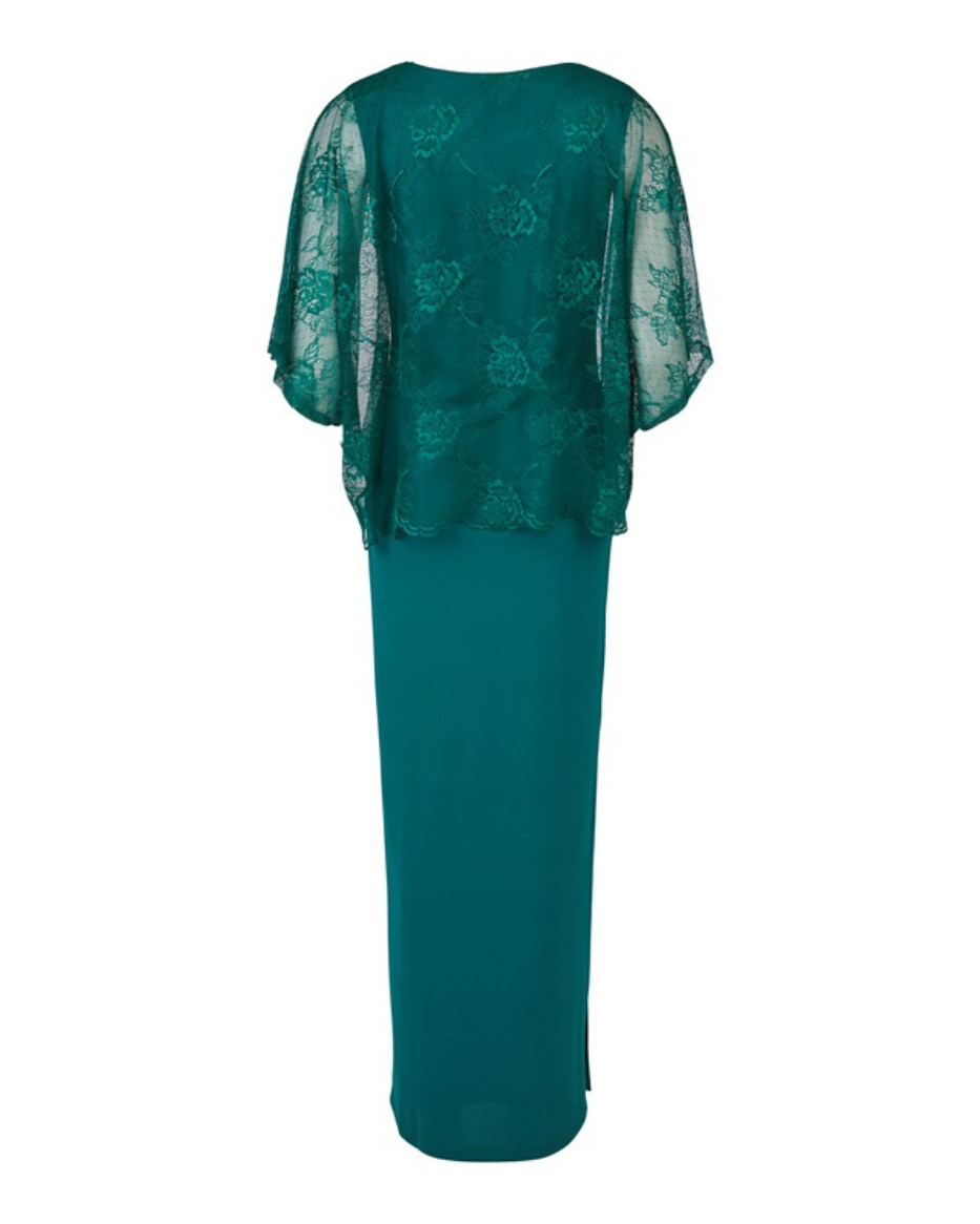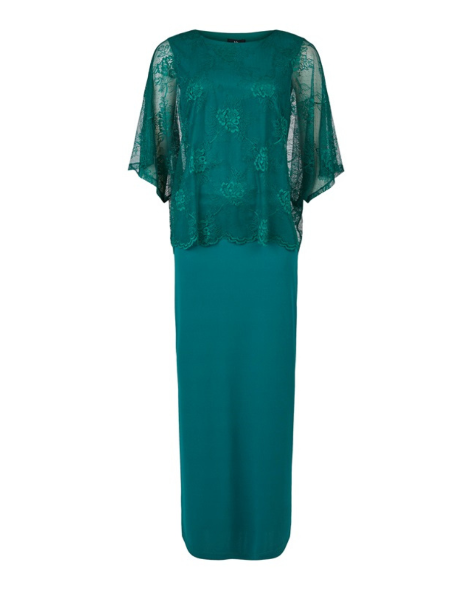 Lang kjole med blondetopp og splitt ved beina. Rundt hals, stretchy materiale og god passform.