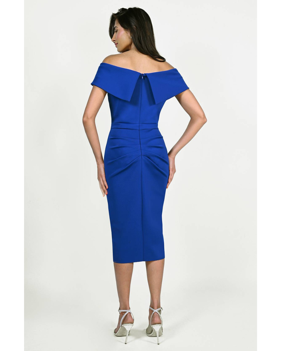 Off the shoulder kjole med v-hals. Kjolen har en split i siden og volanger på forsiden.