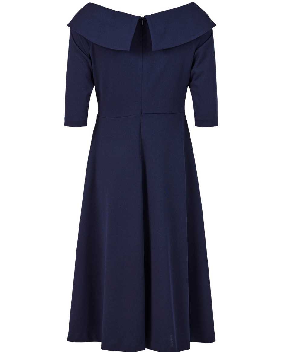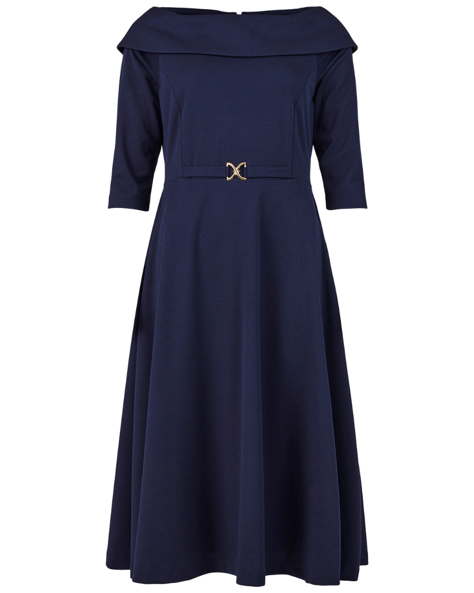 Elegant kjole med rundt hals, 3/4 ermer og festet belte.