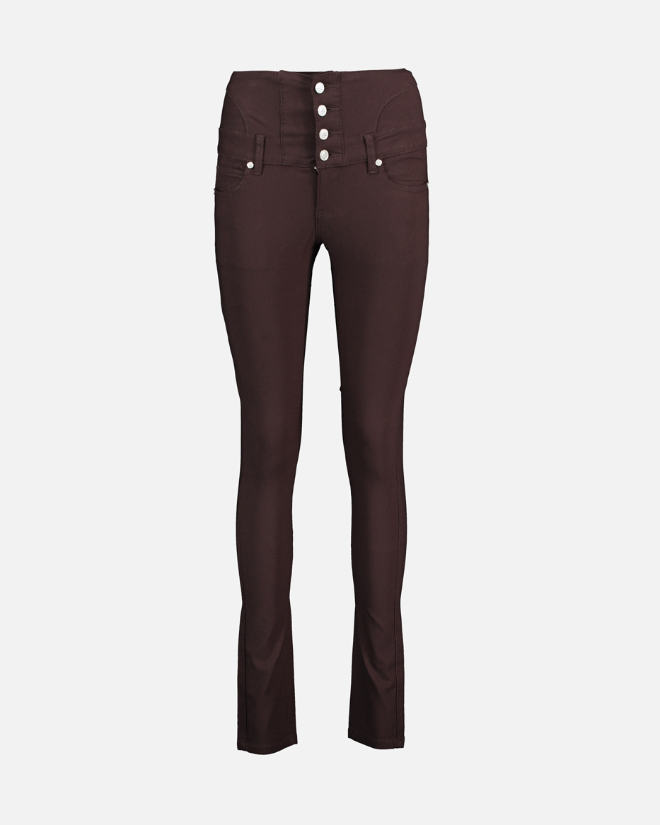 Bukse med ekstra høyt liv, fire knapper og smal passform. Baklommene er plassert midt på rumpa.