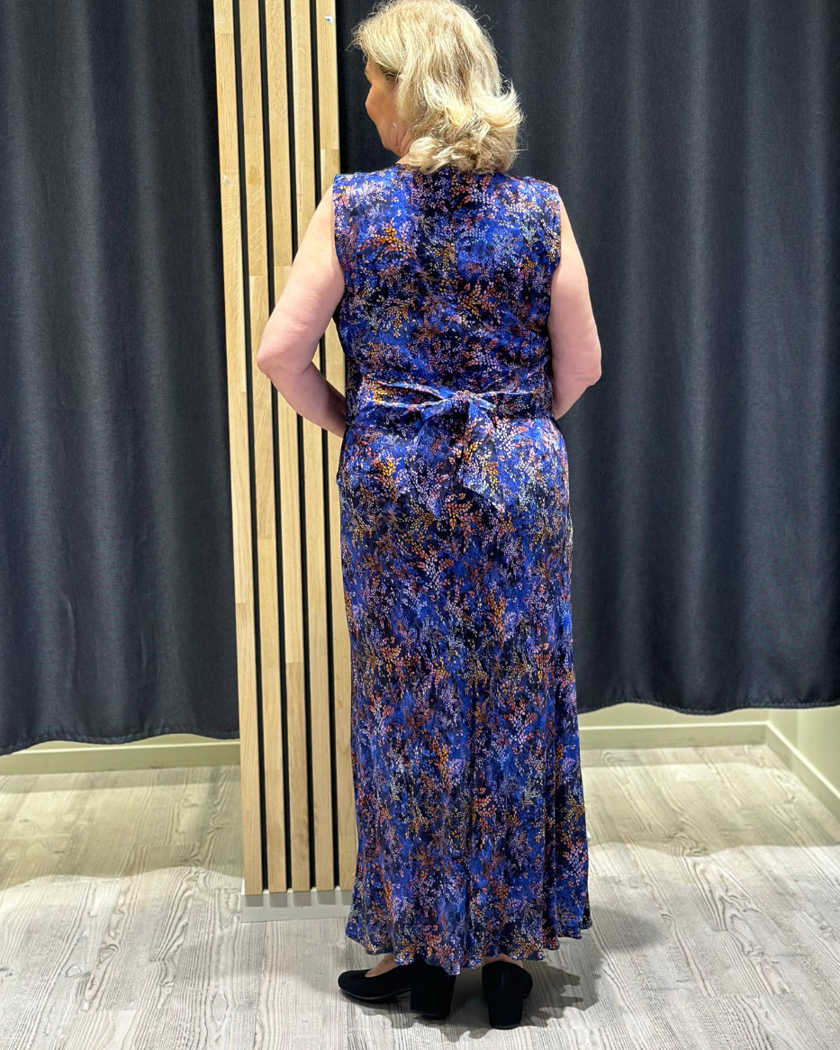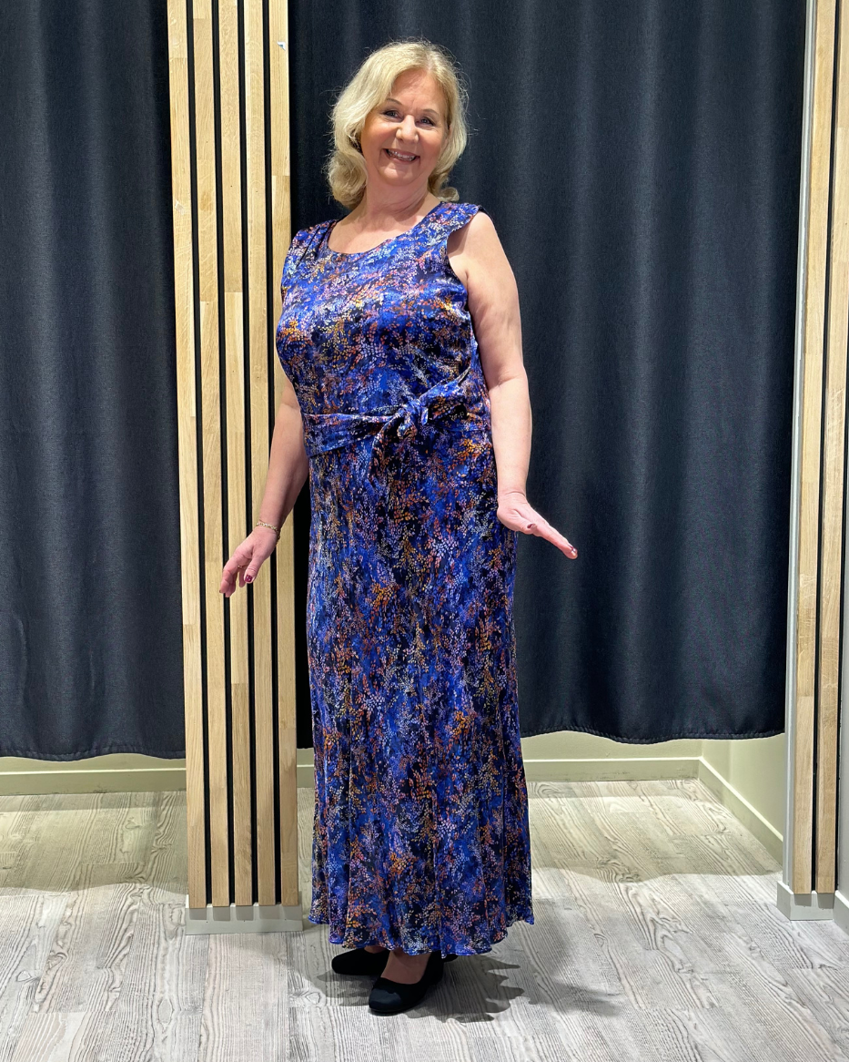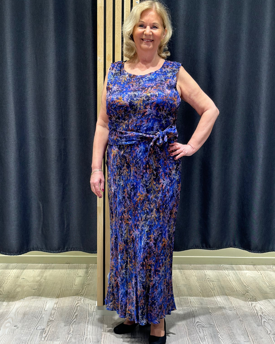 Denne vakre kjolen er perfekt for enhver anledning, enten du ønsker å pynte deg til hverdags eller til fest. Det unike med denne kjolen er beltet som kan brukes både foran og bak, slik at du kan variere stilen etter eget ønske. Med sitt delikate blomsterprint og slanke snitt vil denne kjolen være et strålende tillegg til din garderobe.