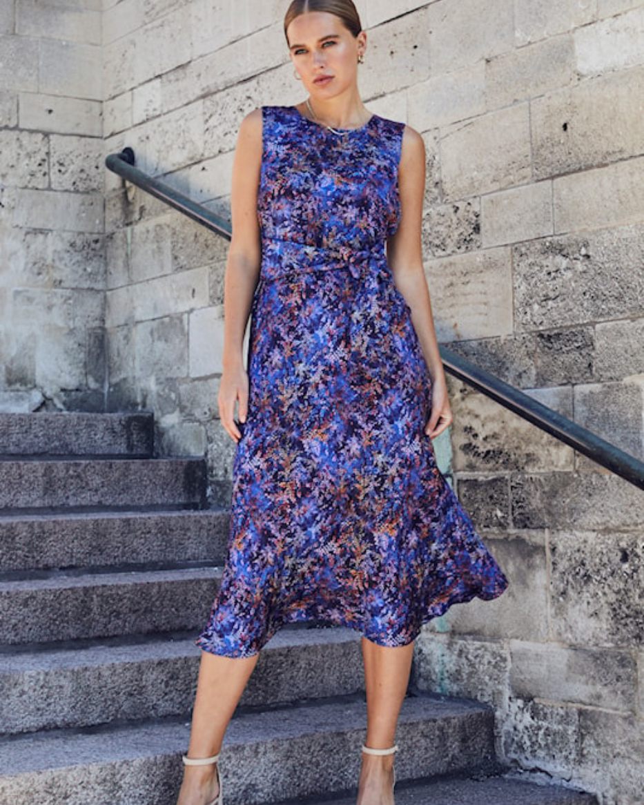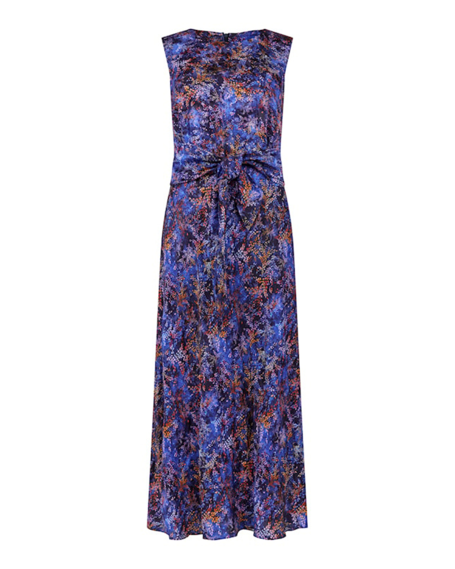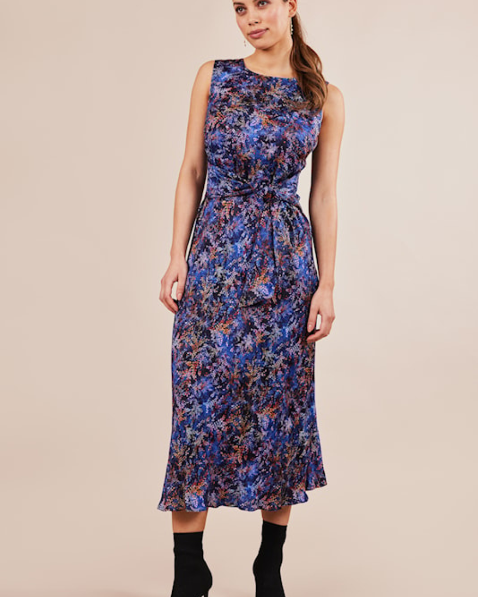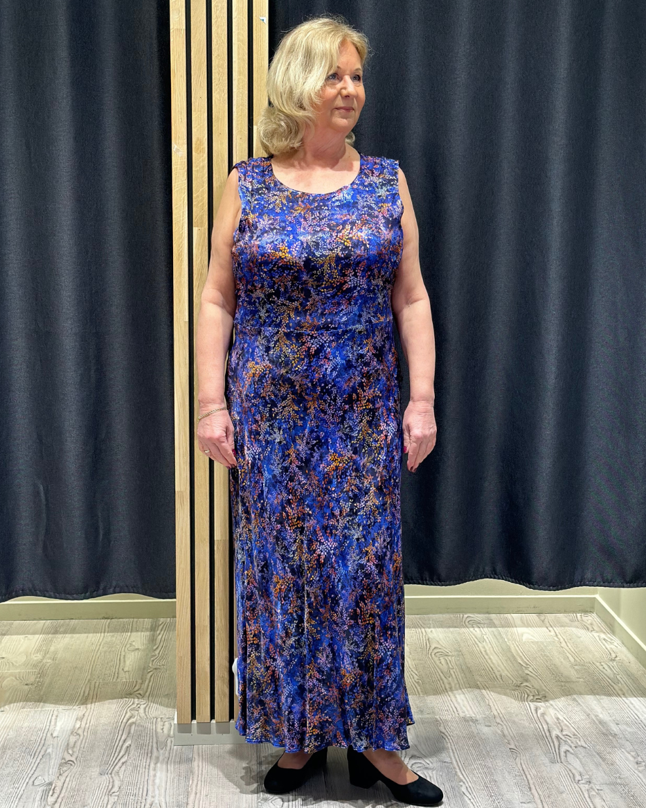 Denne vakre kjolen er perfekt for enhver anledning, enten du ønsker å pynte deg til hverdags eller til fest. Det unike med denne kjolen er beltet som kan brukes både foran og bak, slik at du kan variere stilen etter eget ønske. Med sitt delikate blomsterprint og slanke snitt vil denne kjolen være et strålende tillegg til din garderobe.