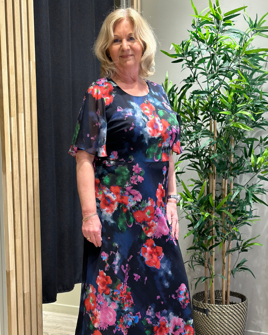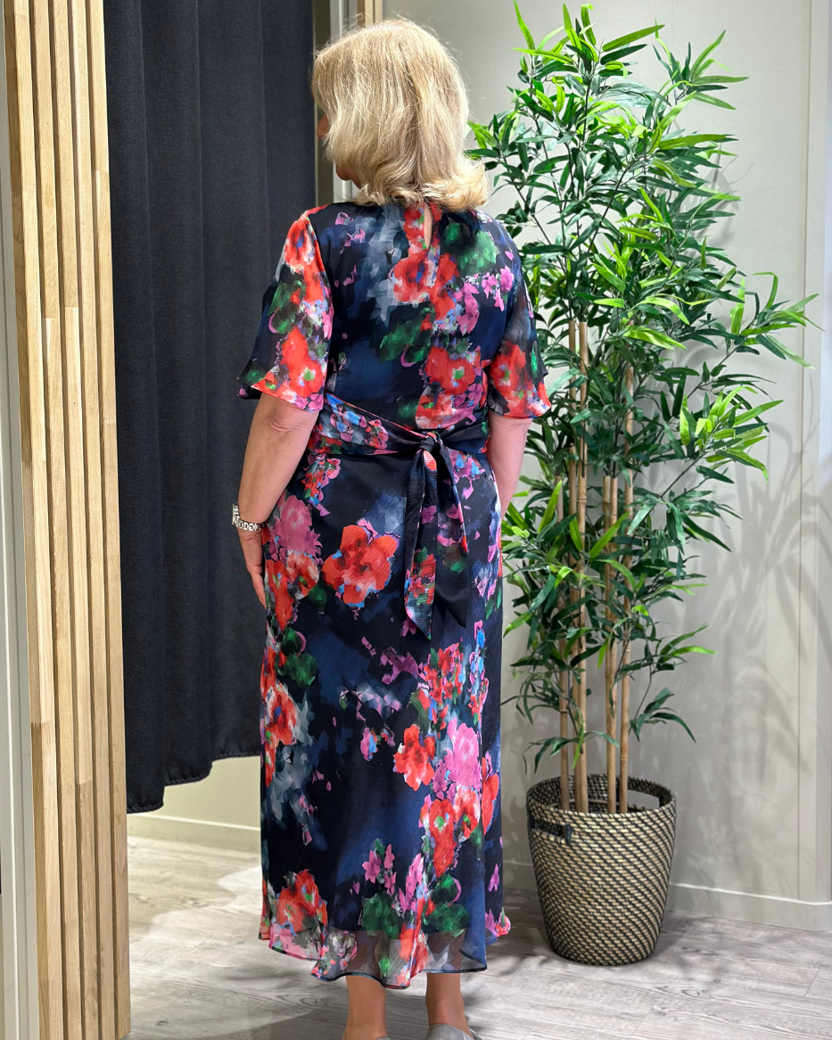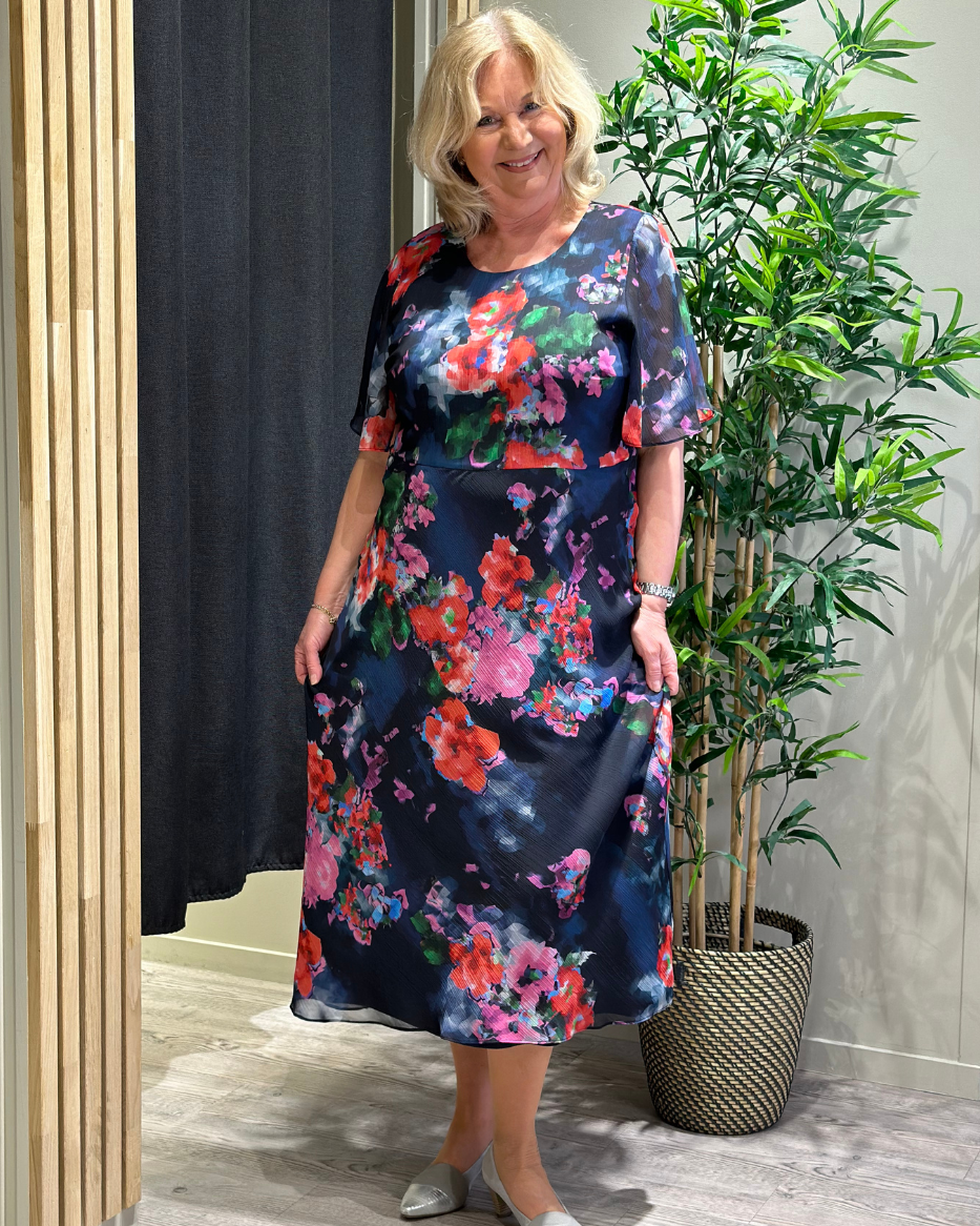 "Utforsk vår ankellange kjole med et lekkert mønster og et elegant pyntebelte i ryggen! Denne stilige kjolen er det perfekte valget for både formelle og uformelle anledninger. Med sitt unike mønster og det delikate pyntebeltet som skaper en vakker silhuett, vil denne kjolen garantert tiltrekke seg oppmerksomhet hvor enn du går. Modellen har rund hals og korte ermer med en liten vippeffekt.