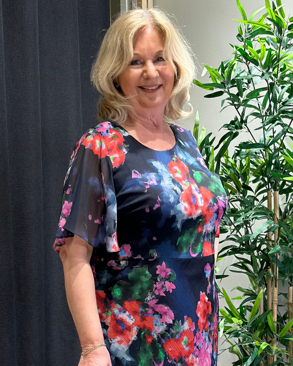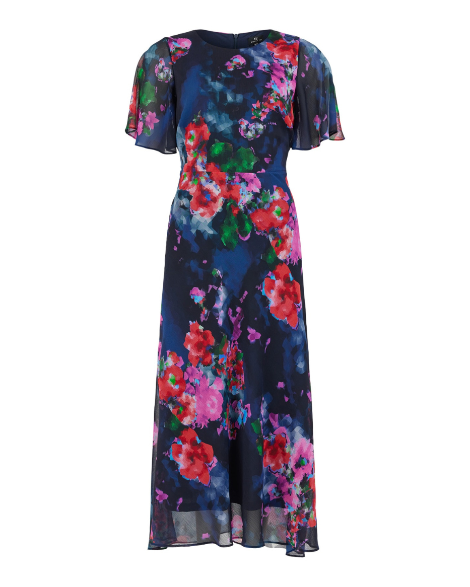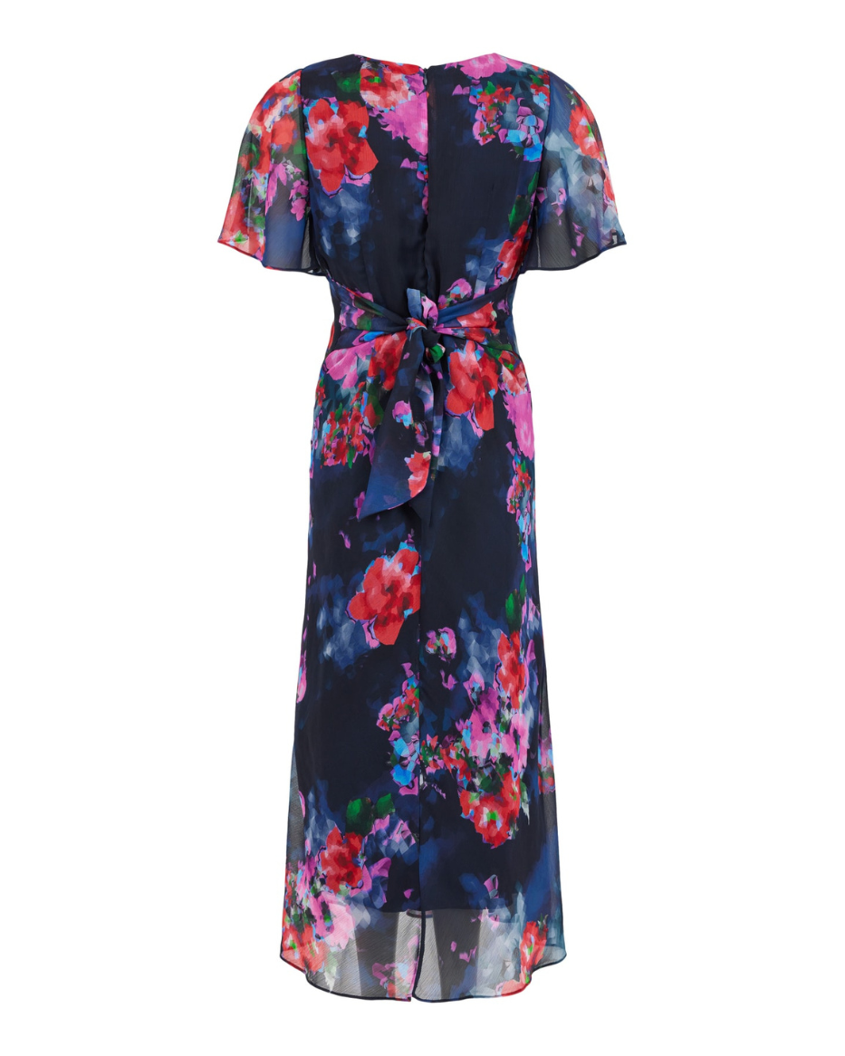 "Utforsk vår ankellange kjole med et lekkert mønster og et elegant pyntebelte i ryggen! Denne stilige kjolen er det perfekte valget for både formelle og uformelle anledninger. Med sitt unike mønster og det delikate pyntebeltet som skaper en vakker silhuett, vil denne kjolen garantert tiltrekke seg oppmerksomhet hvor enn du går. Modellen har rund hals og korte ermer med en liten vippeffekt.
