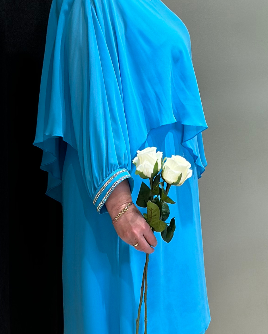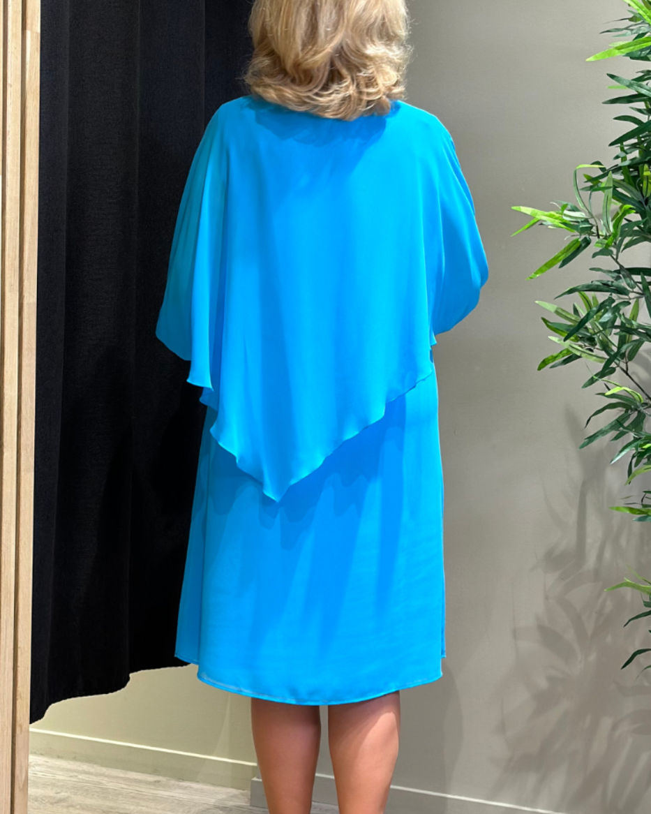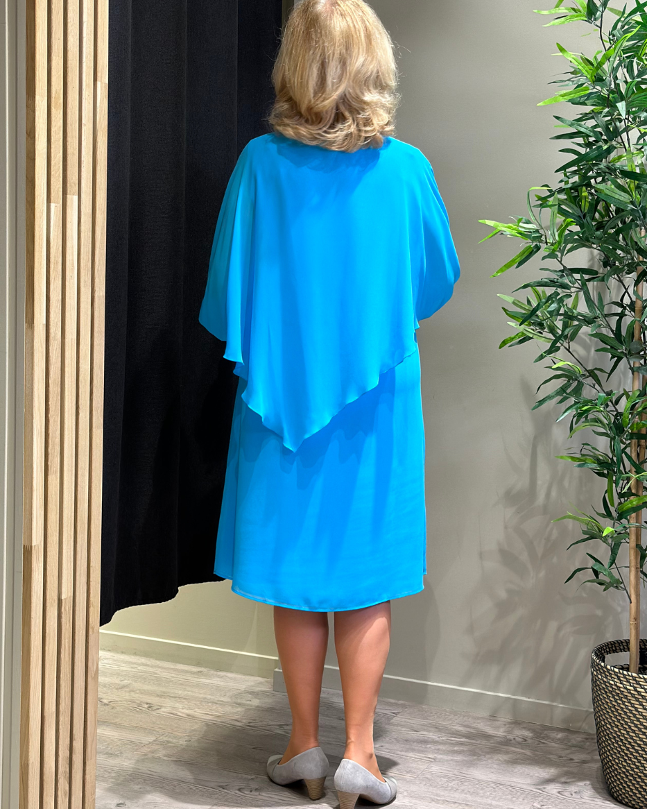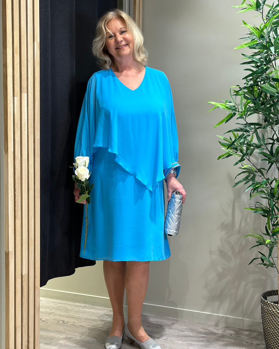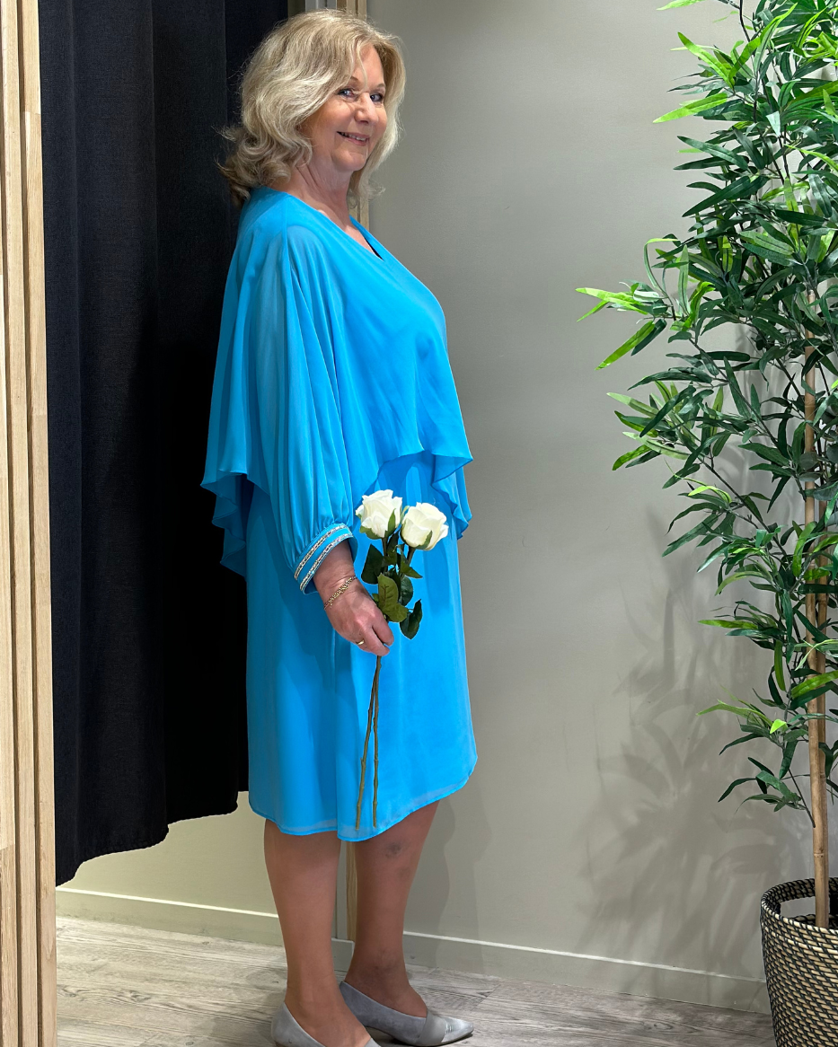 Denne kjolen har en delikat chiffongoverdel som er sydd fast på utsiden, og gir et subtilt og drømmende preg til antrekket ditt. Ermene er prydet med elegante diamantdetaljer som legger til et snev av glamour og raffinement. Med sin kortere lengde er denne kjolen perfekt for festlige anledninger hvor du ønsker å skille deg ut med stil. Modellen har V-hals og lange ermer. Avbildet str på modell er 40.