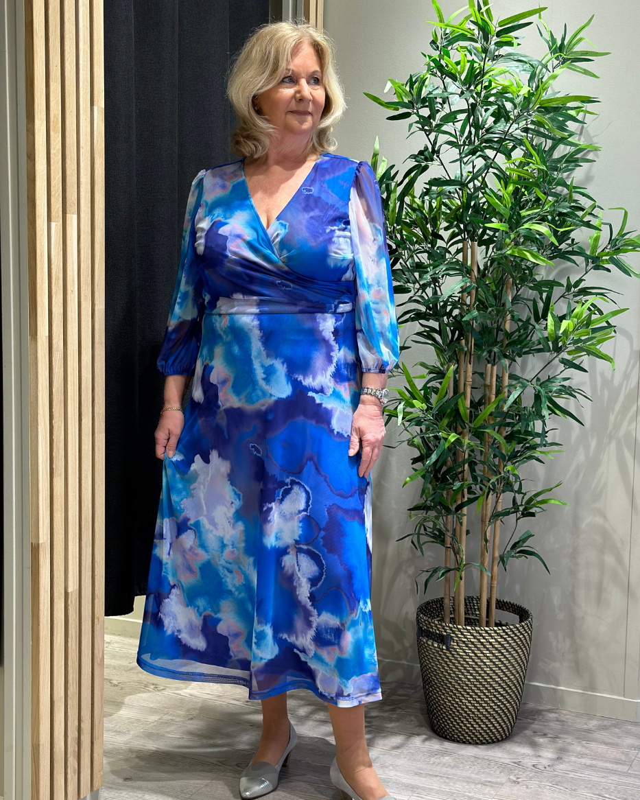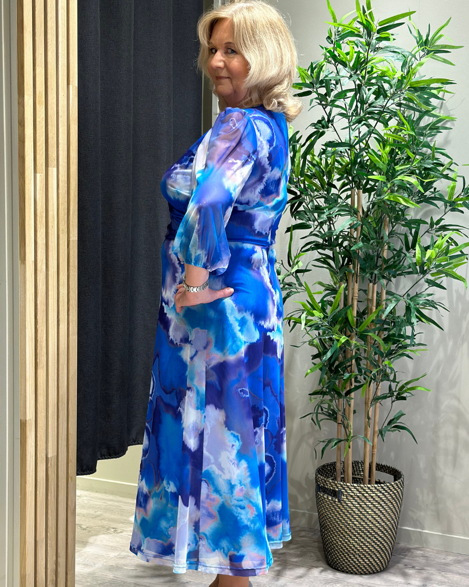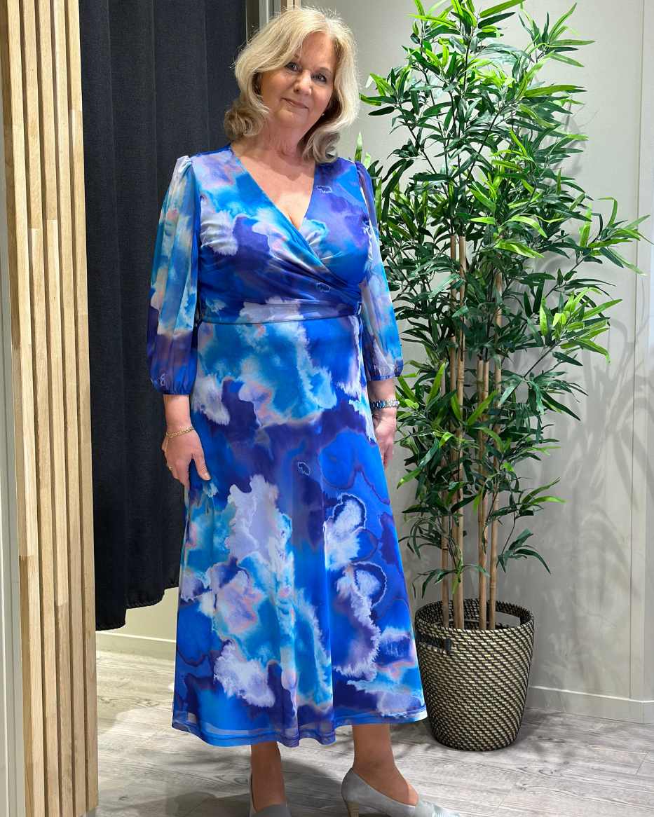 "Oppdag vår nydelige midi-kjole med et vakkert mønster og lange ermer i mesh kvalitet! Denne elegante kjolen er det perfekte valget for enhver anledning, fra kontoret til en kveld på byen. La deg forføre av det delikate mønsteret som legger til en ekstra touch av stil, mens de lange ermene gir deg komfort og varme i kjøligere vær. Fasongen har v-hals og lenge ermer